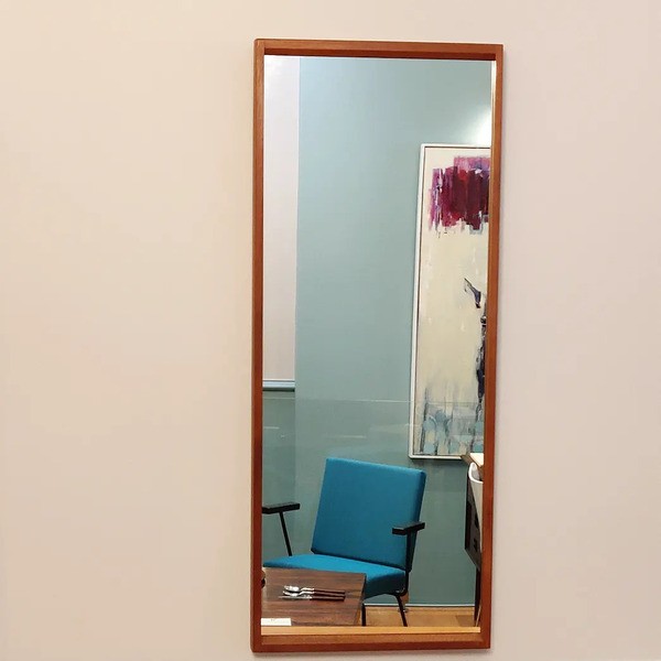 Mid 20th Century Teak Wall Mirror Model 14- Designed by Kai Kristiansen during the 1950s as part of the range of entrance and hall furniture designed for Aksel Kjersgaard from 1955. Manufactured by Aksel Kjersgaard – Founded by cabinet marker Aksel Kjersgaard in 1952. Made in Odder, Denmark. The rectangular frame has angled edges and an inset mirror. On the side of the corners there are three dowels – an extra detail to the design that also strengthens the frame and in Kristiansen’s words “add durability”. The mirror is held by a metal bracket on the top of the mirror
