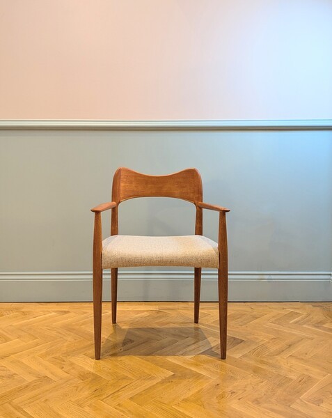 Mid 20th century teak carvers designed by renowned Danish furniture designer Arne Hovmand-Olsen, manufactured by leading furniture manufacturer Mogens Kold Møbelfabrik. The seats have been newly reupholstered in Moon Wool and have had replacement foam added.