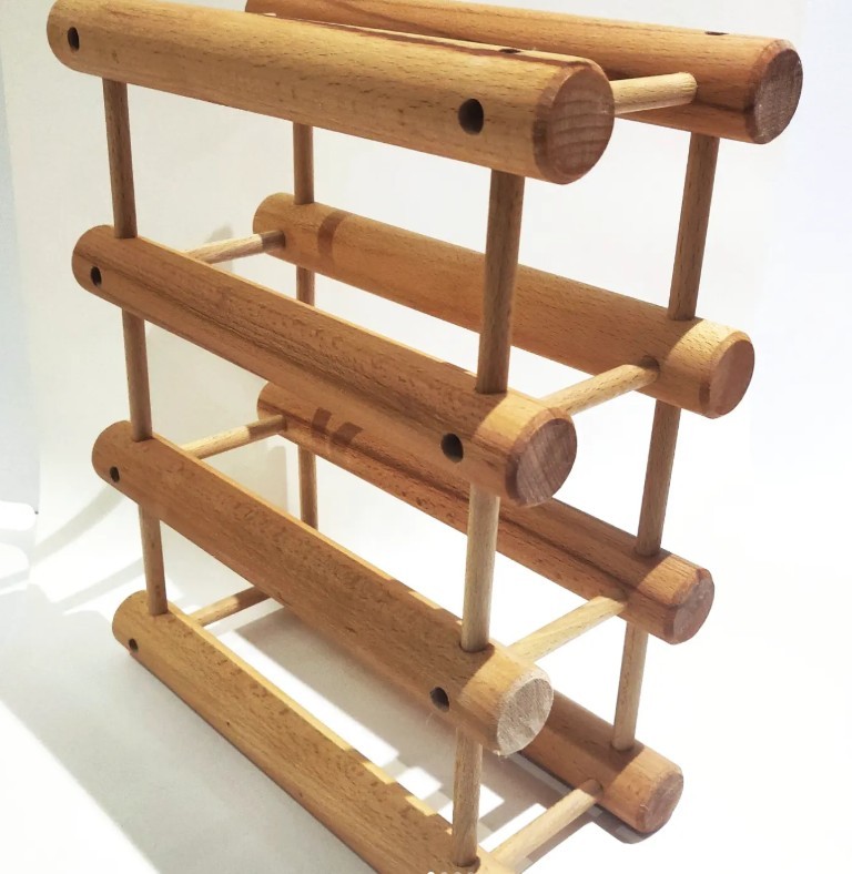 Made from solid beechwood with an oiled finish. In the upright position the rack can hold four bottles, can hold up to six bottles when placed horizontally.