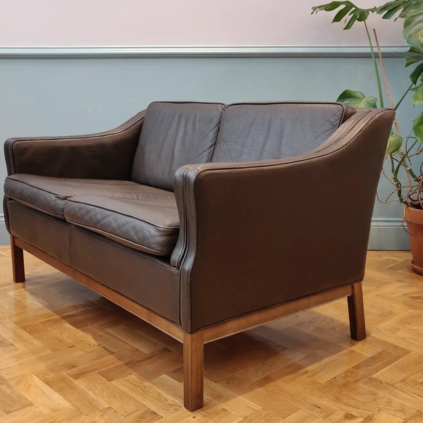 The sofa has two loose backrest and seat cushions, the armrest panels are fixed into position. The base fabric used is a brown quilted cotton. The loose cushions have a zip fastening and have a brand new foam cushion. The legs are wooden (stained) and connected to a wooden base frame (this can be removed for transportation and storage purposes) this has been stained a medium brown tone. The base of the sofa is webbed with an elasticated webbing and in good order.