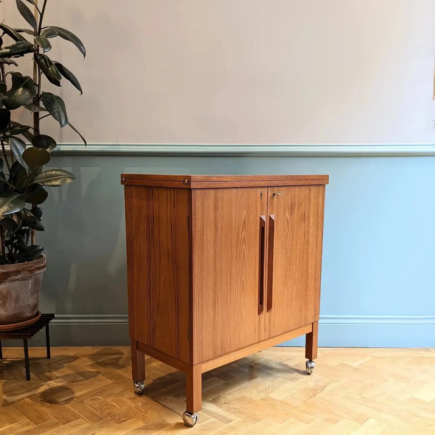 Mid 20th century teak bar. Designed by Torbjorn Afdal, manufactured by Mellemstrands Trevare Industri / Bruksbo. Made in Norway. This piece has a sliding extending top which locks into position when the cabinet doors are open, creating a bar. Internal storage includes shelving on the inside of the doors.