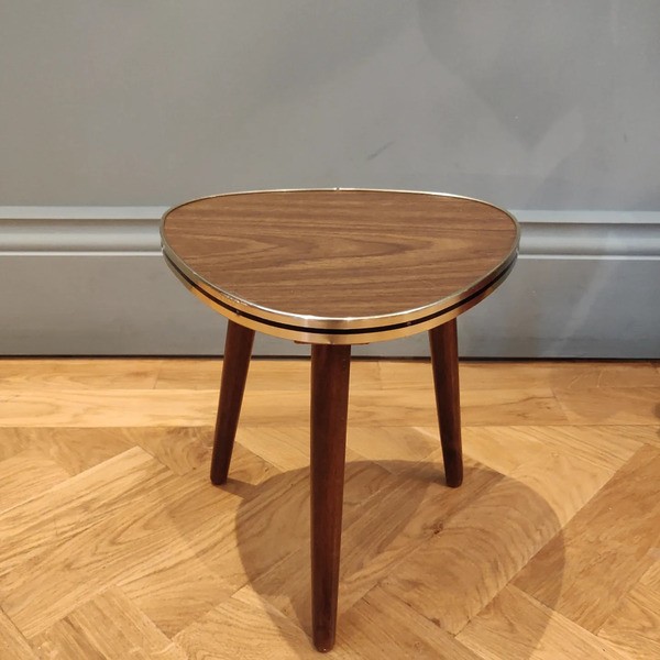 Mid 20th Century Plant Table The table has a faux wood patterned surface, made from formica, mounted on a chip board base material. The edging around the table top is gold coloured with a black stripe. There are three turned legs, finished in a dark brown stain. The table is a triangular shape with rounded corners. Suitable for use as an indoor plant stand or as a side table.