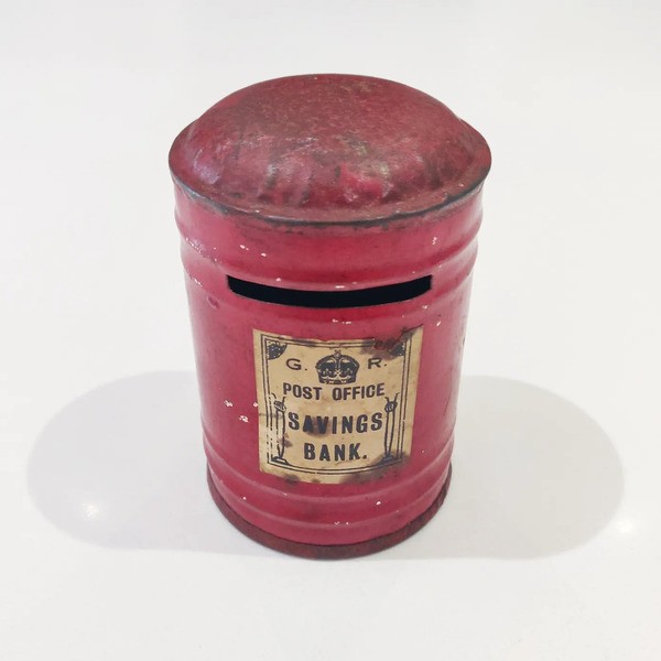 George V Post Box Savings Bank. Money box shaped as a red post box from between 1910-1936 during the George V era. The money bank reads “G R, Post Office, Savings Bank” The paper label is cream with black lettering and has decorative details. The metal is painted dark red The moulded metal box has a rounded top with a coin slot. There is no way of opening this money bank without damaging it, so it is best used as a decorative piece.