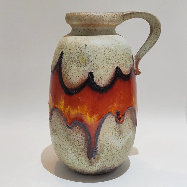 Mid 20th Century Ceramic Handled Jug/Vase Made by West German ceramics manufacturer Scheurich Keramik Marked on the base with W. Germany 484 – 27 (the number 484 refers to the shape number, while the 27 refers to the height of the piece) The marks are applied as relief, typical of Scheurich’s markings The vase has a matt grey/beige mottled glaze with an asymmetric orange, yellow and red mirror glaze detail running round the middle of the vase. this is outlined in a dark brown. The interior of the vase is a dark brown/black gloss glaze and is visible around the opening.