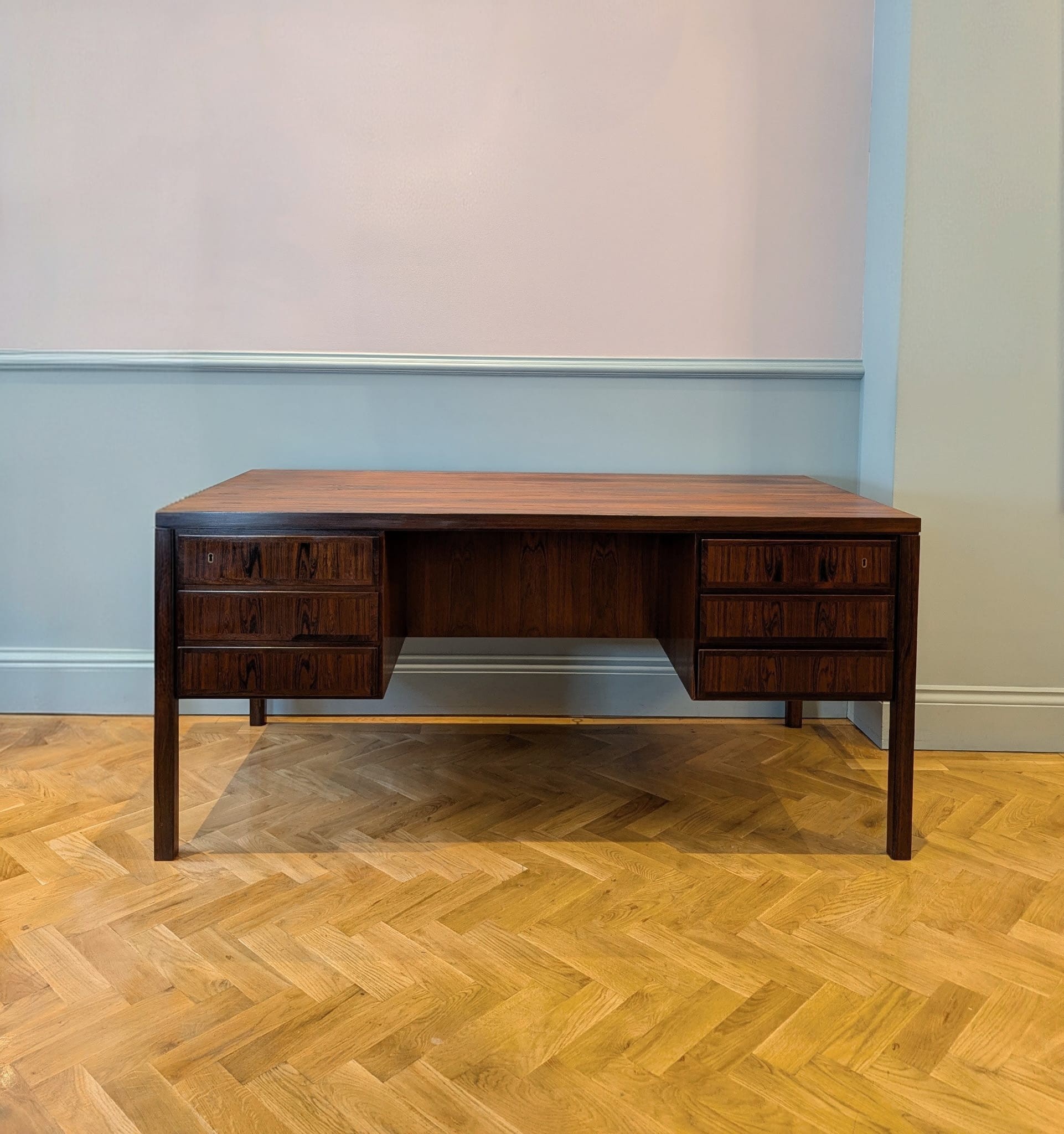 Mid 20th century rosewood desk Model 77 Designed by Gunni Omann Produced from 1960-1987 by Omann Jun Møbelfabrik, Denmark This desk has six drawers to the front, with lockable top drawers (these are both working) The reverse of the desk has two open bookcases and a central lockable cabinet. The desk has been constructed from a combination of solid rosewood and rosewood veneer.