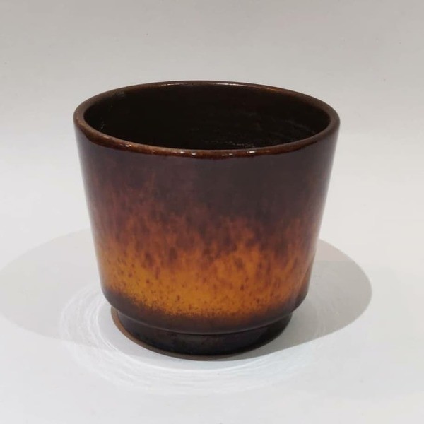 Main colour is brown with mottled orange details in a central band, there is a high gloss finish to the glaze. The interior is a matt brown glaze, visible around the rim. Suitable for indoor use only