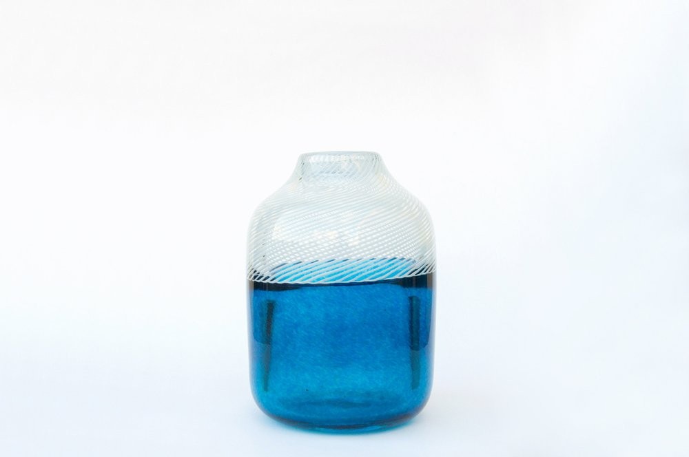 White striped and blue hand-blown 18cm vase. This collection is a reminiscence of the summer days spent by the Aegean coast and Greek Islands. Blue salt water, sand and ivory rocks in spires the colour scheme of this collection. This unique collection seamlessly merges the in-calmo technique with “Çeşm-i Bülbül,” a traditional Ottoman glassblowing technique. Crafted by skilled Turkish glassblowers in Istanbul, each piece is handmade, resulting in variations in colour and size that add to the distinctive charm of these items, underscoring their artisanal and handcrafted nature.