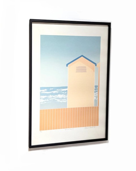 The print features a beach scene in pastel blues and peach tones with beach huts in the fore front and the sea in the background. The title of the work is written in pencil under the picture centred, with the artist signature and date to the bottom right hand side and the number to the bottom left. It has been newly professionally framed in a dark grey/black wooden frame.