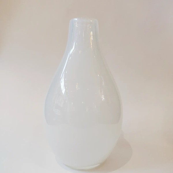 Large bulbous base, which narrows to the neck. The glass is translucent and has a pearly white finish