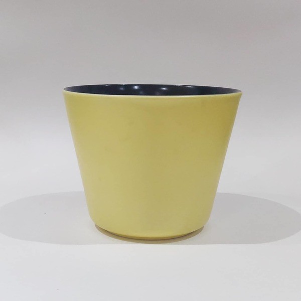 Pale yellow exterior matt glaze, with a dark grey interior glaze